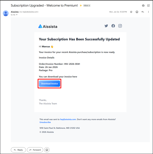 Every time you purchase or upgrade a subscription, a confirmation email is sent to your registered email address.