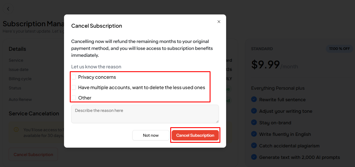 A pop-up window will appear asking for the reason for your cancellation.