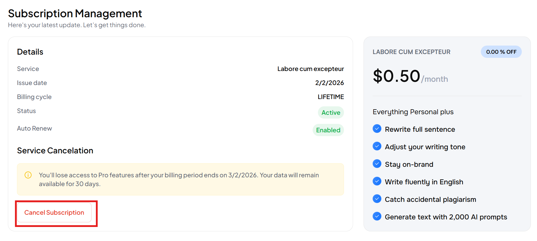 Scroll down to the Service Cancellation section and click the Cancel Subscription button.
