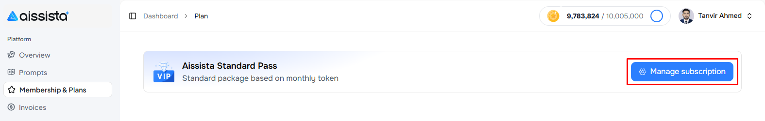 On the plan overview page, locate your active plan and click the Manage subscription button.