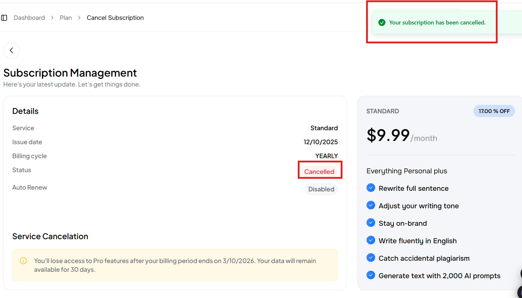 Your subscription status will now display as Cancelled, and Auto Renew will be shown as Disabled.