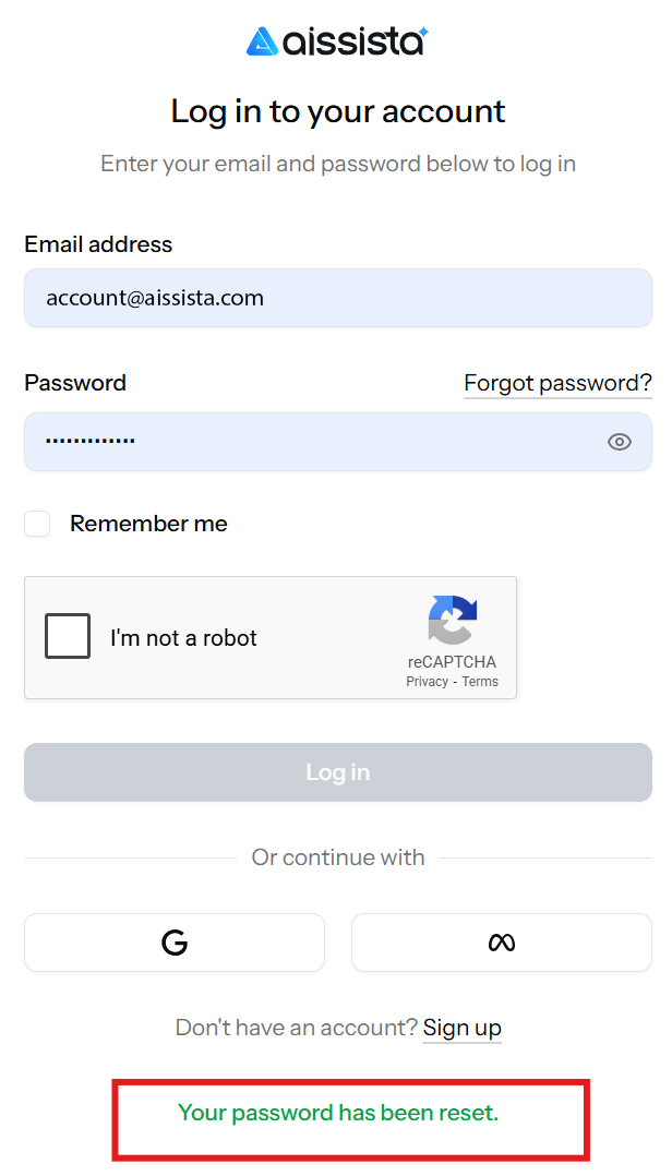 Once successful, you will be redirected to the login page with a green confirmation message: Your password has been reset. You can now log in using your new credentials.