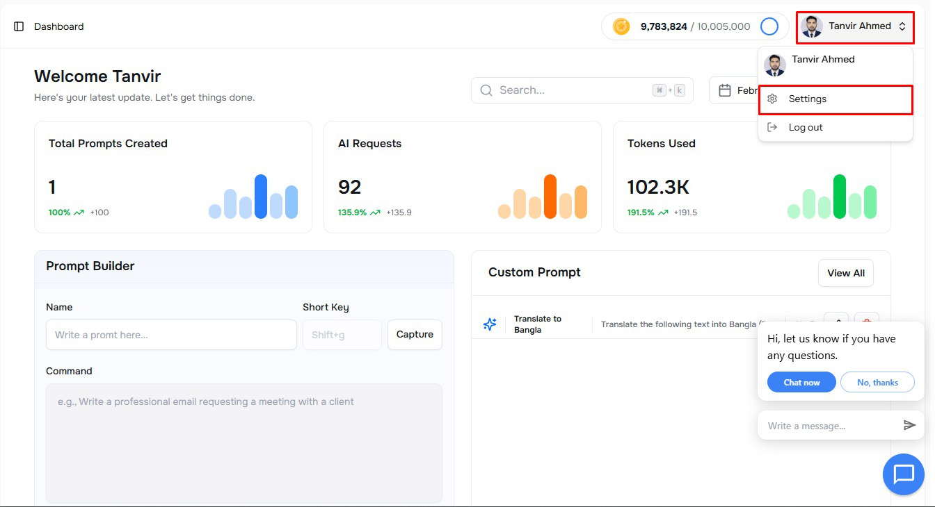 Method A: Click on your Profile Name/Avatar in the top right corner and select Settings from the dropdown menu.