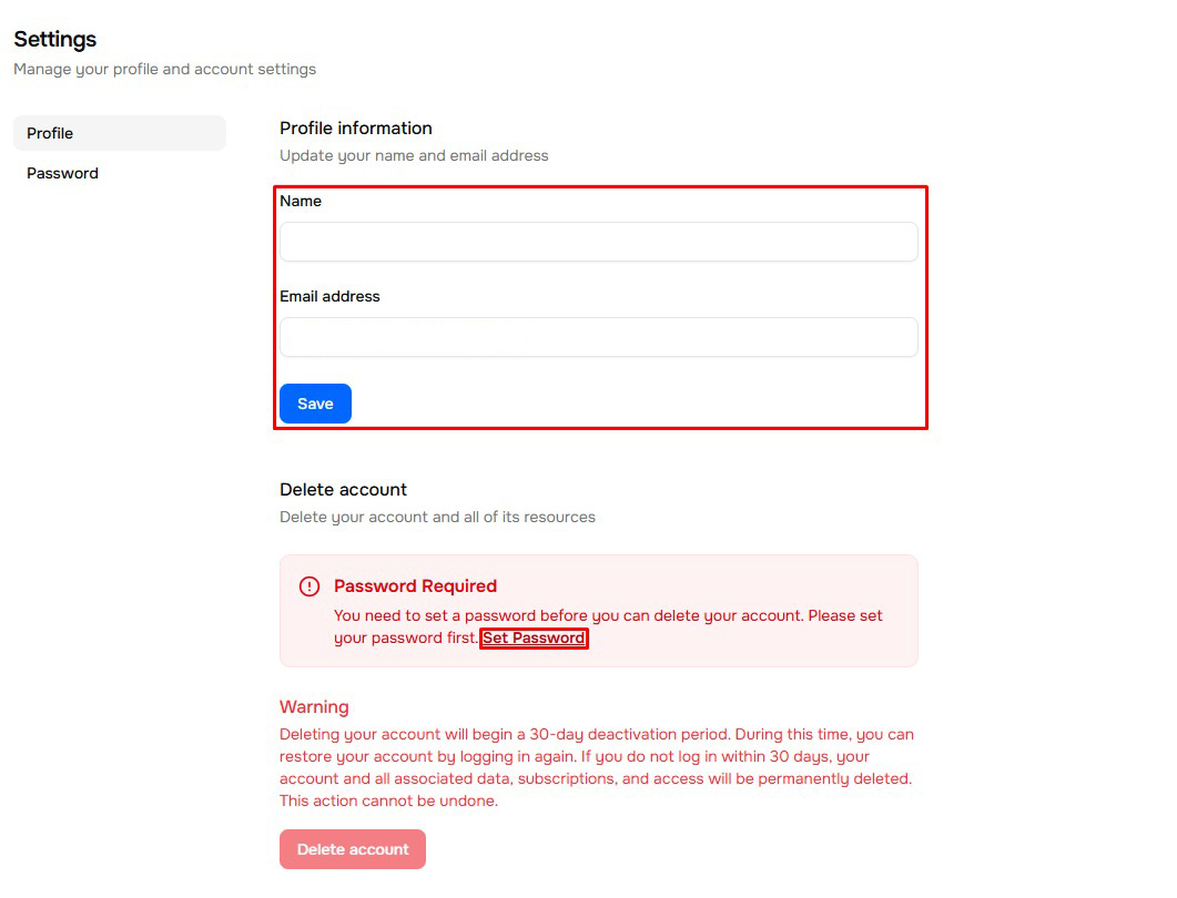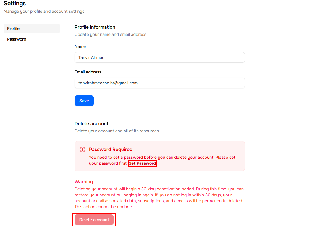 Note: If you haven't set a password yet (e.g., if you signed up via Google or Meta), you will be prompted to Set Password first before you can proceed with deletion.